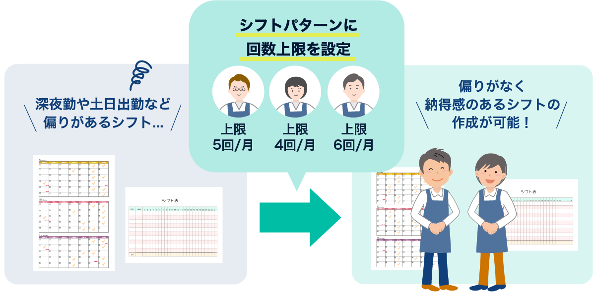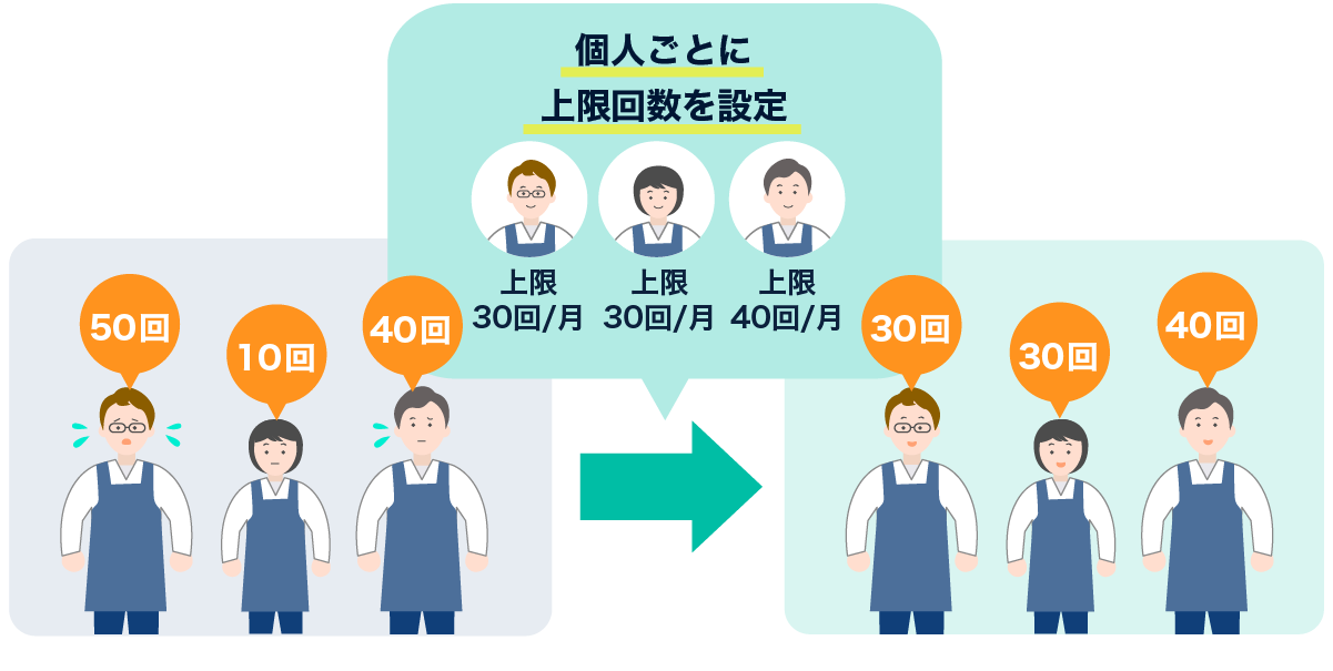 深夜勤務や土日の出勤などが一人のスタッフに集中してしまうことで不満が出ないように、月間の勤務上限回数を設定することができます。