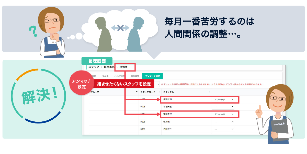 スタッフの相性を考慮して誰もが働きやすい環境をつくるアンマッチ機能