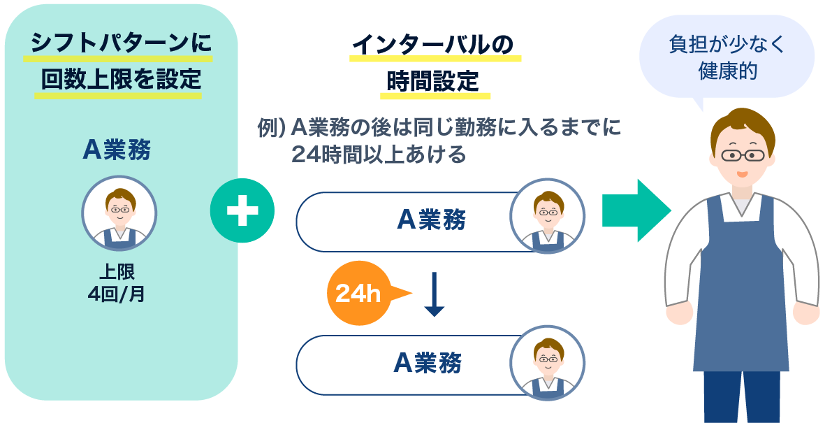 深夜勤務や土日出勤のシフト回数上限設定との組み合わせで、より公平なシフトを作成することが出来ます。また業務負荷の大きなタスクに対しても一定のインターバルを設定して身体の負担を軽減させることも出来ます。